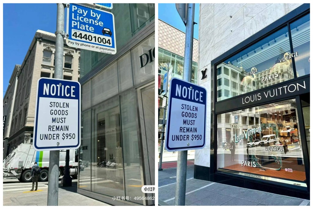A public sign for the nation of thieves: stolen goods values must be under US$950 明碼實價的鼓勵. 舊金山的風景線. Is this the country you want to raise your children or grandchildren!? 這就是你想要養育子孫的國家嗎?
