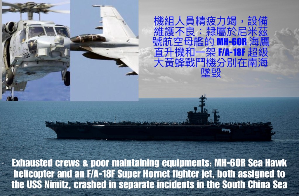 Exhausted crews & poor maintaining equipments: MH-60R Sea Hawk helicopter and an F/A-18F Super Hornet fighter jet, both assigned to the USS Nimitz, crashed in separate incidents in the South China Sea 美國空軍機組人員精疲力竭,設備維護不良:隸屬於尼米茲號航空母艦的 MH-60R 海鷹直升機和一架 F/A-18F 超級大黃蜂戰鬥機分別在南海墜毀