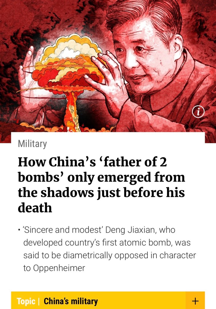 Tuesday marks the centenary of the birth of Deng, the physicist who played a key role in developing China’s atomic and hydrogen bombs and who has now become a totemic figure in the story of China’s military development known as the “father of two bombs”.
