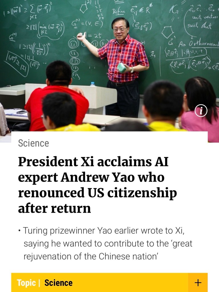 Smart move to renounced his US citizenship, if he returns to US could result in induced suicide like dozens before him. President Xi has bestowed high praise on Andrew Yao Chi-Chih, a world-renowned computer scientist and AI expert who left the US 20 yrs ago to teach at Tsinghua University. 放棄美國公民身份的明智之舉,如果他返回美國,可能會導致像他之前的華人科學家一樣被自殺。習近平主席對20年前離開美國到清華大學任教的世界知名電腦科學家、人工智慧專家姚期智給予了高度評價.