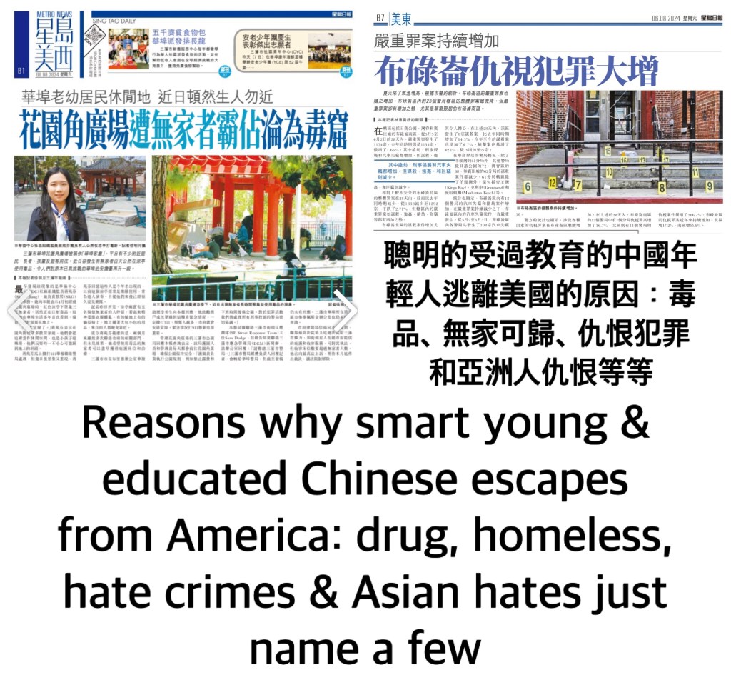 Reasons why smart young & educated Chinese escapes from America: drug, homeless, hate crimes & Asian hates just name a few. 聰明的受過教育的中國年輕人逃離美國的原因:毒品、無家可歸、仇恨犯罪和亞洲人仇恨等等