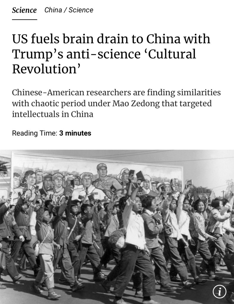 SCMP: US fuels brain drain to China with Trump’s anti-science ‘Cultural Revolution’! Political purges, funding cuts and a growing hostility towards expertise have unsettled the US Chinese research community, prompting many to look to China for stability. In the long run, likely to inflict “irreparable damage” on the US research and development system. 《南華早報》:川普發動反科學“文化大革命”,加劇人才外流中國!政治清洗、資金削減以及對專業人才日益增長的敵意,令美國華裔科研界感到不安,促使許多人轉向中國尋求穩定。長遠來看,這可能會對美國研發體系造成「無法彌補的傷害」. https://www.scmp.com/news/china/science/article/3329862/us-fuels-brain-drain-china-trumps-anti-science-cultural-revolution?