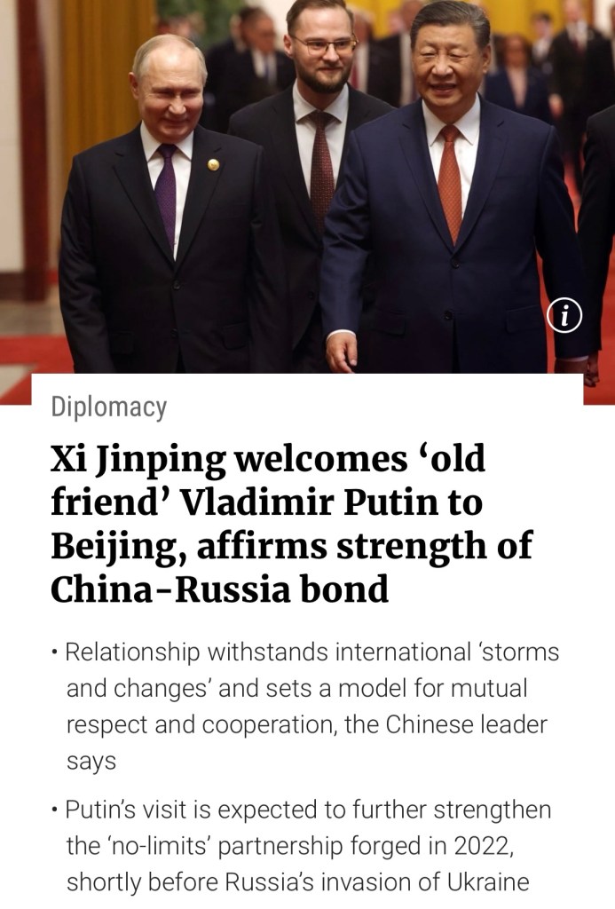 SCMP: Chinese President Xi Jinping welcomed his “old friend” Vladimir Putin to Beijing on Thursday, at the start of the Russian leader’s state visit and reaffirmed China’s role as a trusted friend. 香港南華早報:週四,中國國家主席習近平在俄羅斯領導人對普丁進行國事訪問之際,歡迎他的「老朋友」普丁來到北京,並重申了中國作為值得信賴的朋友的角色.