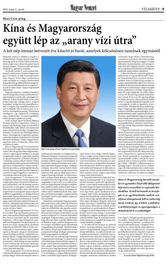 President Xi Jinping’s article “Embarking on a Golden Voyage in China-Hungary Relations” published in the Hungarian newspaper Magyar Nemzet.