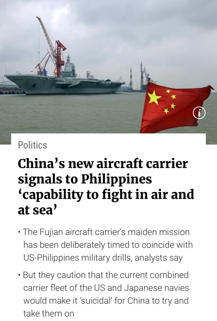 The Philippines should be alert to the “potent challenge” posed by China’s latest aircraft carrier, the Fujian, as security analysts warn that Beijing’s flexing of its naval muscles is a “message to all parties” that it is prepared for air and sea warfare in the region’s contentious waters. 菲律賓應該警惕中國最新航母福建號所構成的“潛在挑戰”,因為安全分析人士警告說,北京展示其海軍力量是“向各方發出的信息”,表明它已做好在菲律賓發動空海戰的準備.