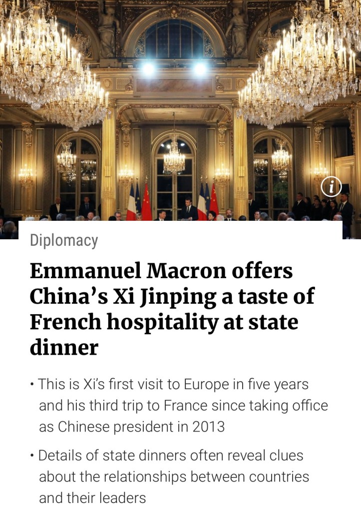 President Xi Jinping was hosted by his French counterpart Emmanuel Macron at a state dinner at the Élysée Palace. World has 2 cuisines where others copy and involved from: Chinese and French. 國家主席習近平在愛麗舍宮舉行國宴,受到法國總統馬克宏的款待。世界上祇有兩種菜係被其他人複製和參與:中國菜和法國菜.