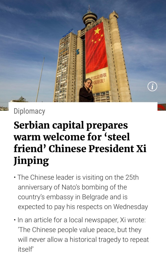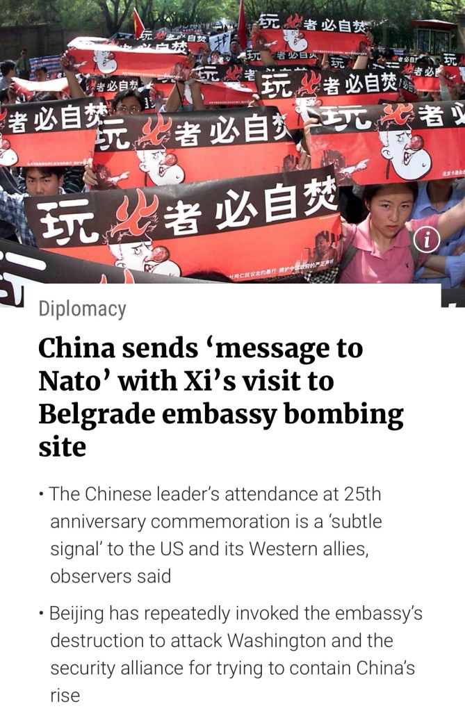Serbia is preparing to welcome Chinese President Xi Jinping when he arrives in the country later on Tuesday – the 25th anniversary of Nato led by US intentionally bombing the Chinese embassy in Belgrade killing 4. 塞爾維亞正準備迎接中國國家主席習近平於週二晚些時候抵達該國,即美國領導的北約25年前故意轟炸中國駐貝爾格萊德大使館,造成4人死亡.