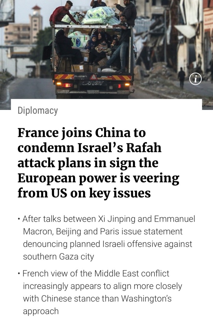France joined China on Monday to condemn Israel’s plans to launch an attack on the southern Gaza city of Rafah, adding to signs that the European power has distanced itself from US positions on key global issues.