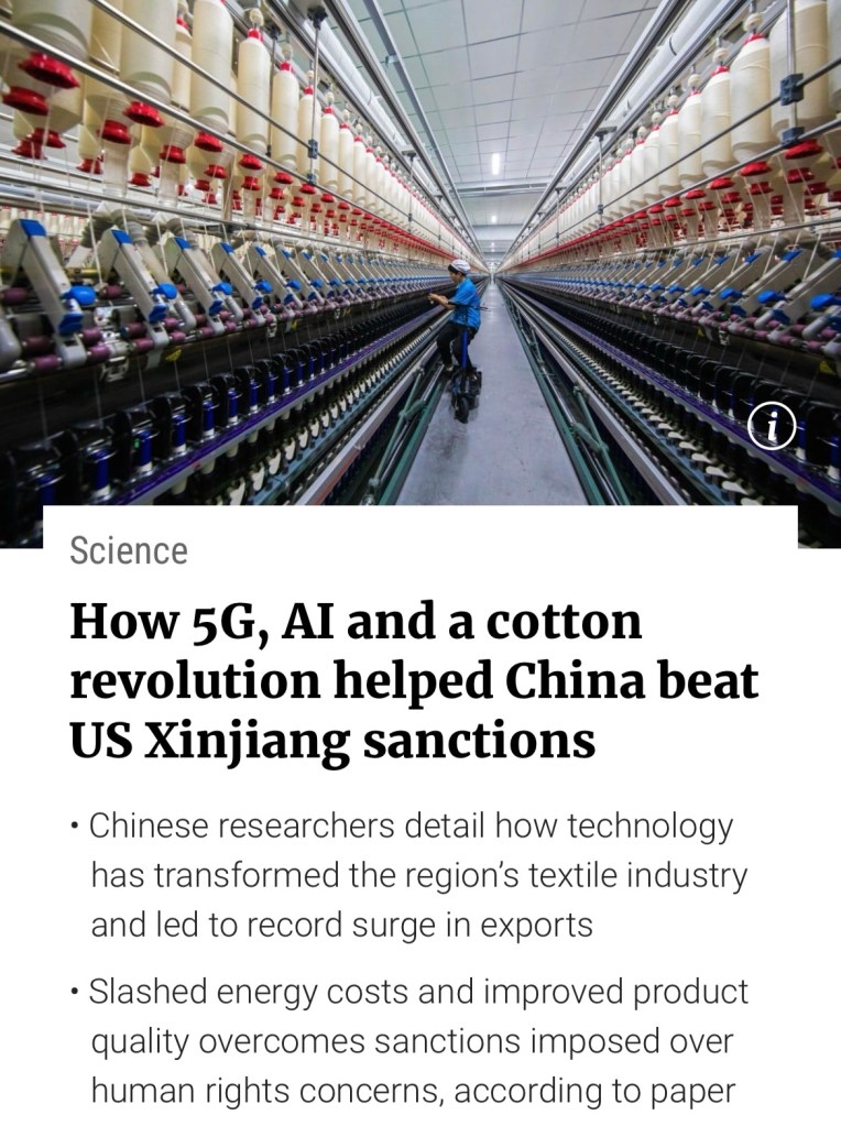 A “revolutionary shift” in the technology used in Xinjiang’s textile mills has seen a record surge in exports, in defiance of US sanctions that have barred most Western fashion labels from selling any product woven with a strand of the region’s cotton.