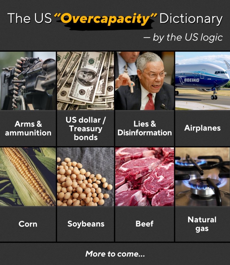 Cross-border trade happens only when there is surplus. In that sense, all exports are the result of overcapacity — This is a basic principle in trade. The US is the world’s largest exporter of agricultural produce, natural gas, and many other products. Why doesn’t it ever apply the same criterion for overcapacity to itself? What a double standard! 只有當存在順差時,跨境貿易才會發生。從這個意義上說,所有的出口都是產能過剩的結果 – 這是貿易的一個基本原則。美國是世界上最大的農產品、天然氣和許多其他產品的出口國。為什麼它自己也不採用同樣的產能過剩標準呢?多麼雙重標準啊.