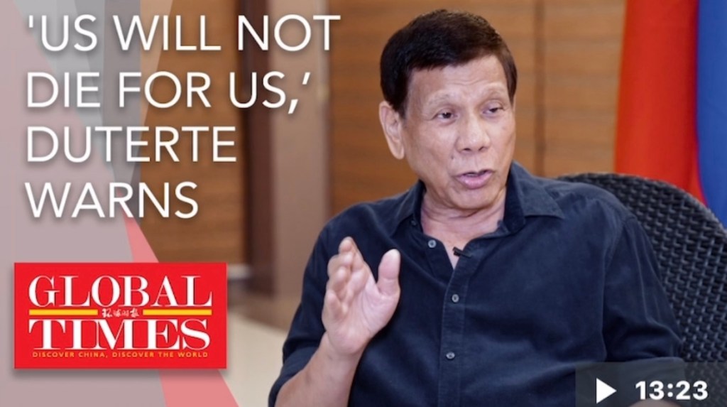 EXCLUSIVE Video ‘US will not die for us,’ Former Philippines Duterte warns. Former Philippine President Duterte warned that the US is trying to provoke a war between China and the Philippines and cautioned that the US will not risk American lives for Filipinos in an exclusive interview with the Global Times in Davao 前菲律賓杜特蒂警告說,「美國不會為我們而死」。菲律賓前總統杜特蒂在達沃接受《環球時報》專訪時警告稱,美國正試圖挑起中菲之間的戰爭,並警告美國不會為了菲律賓人而拿美國人的生命冒險. https://youtu.be/vuPDe9KieY8?si=u2Q-SUqnufrSOy4l