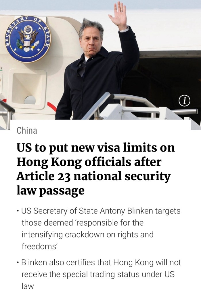 HK homeland security law (article 23) put an end to US terrorists activists. If one is not terrorist or engaged in subversive activities in HK, article 23 harmless! The countries that get upset are obvious culprits, foxes showing its tails. 香港國土安全法(第23條)杜絕了美國在香港恐怖活動。如果不是恐怖分子或在香港從事顛覆活動,第23條無害!那些感到不安的國家顯然是罪魁禍首,狐狸終於露出了尾巴.