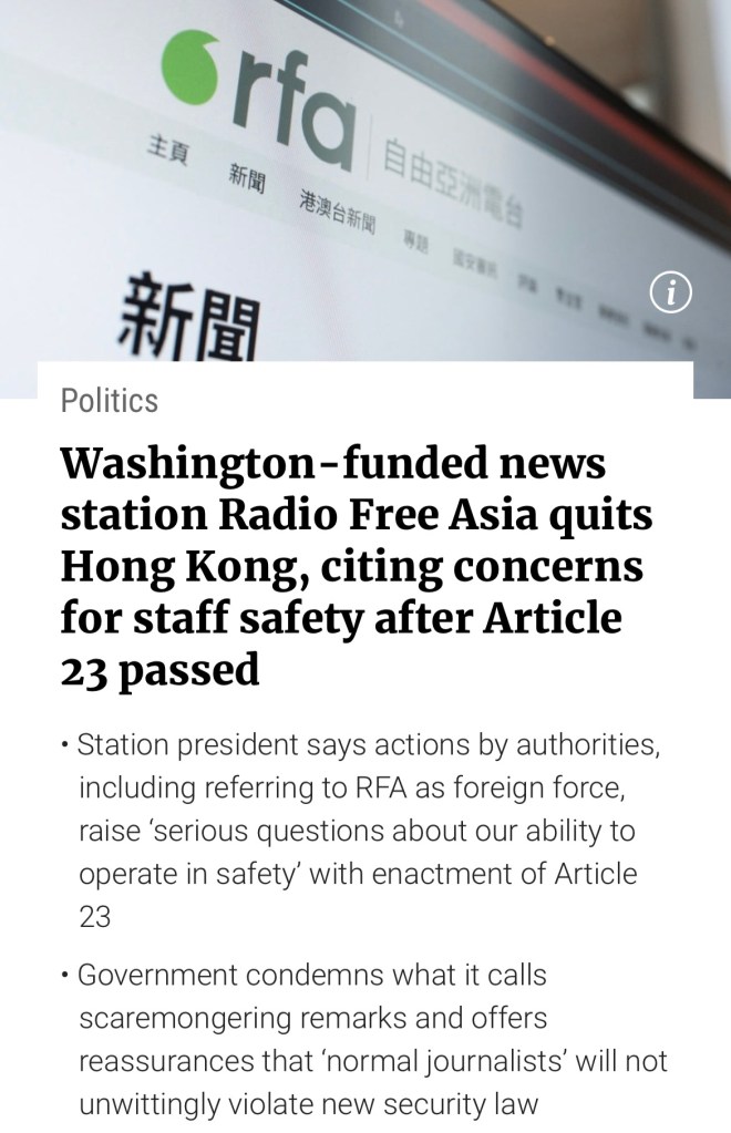 Washington-funded news station Radio Free Asia engaged in fake news and subversive activities in HK against China announced the closure of its Hong Kong bureau on Friday due to what it said were safety concerns for its reporting staff after Article 23. 華盛頓資助的自由亞洲電台在香港從事針對中國和香港的假新聞和顛覆活動,週五宣布關閉其香港分社,稱其報道人員在第23條國安法實施後存在安全問題.
