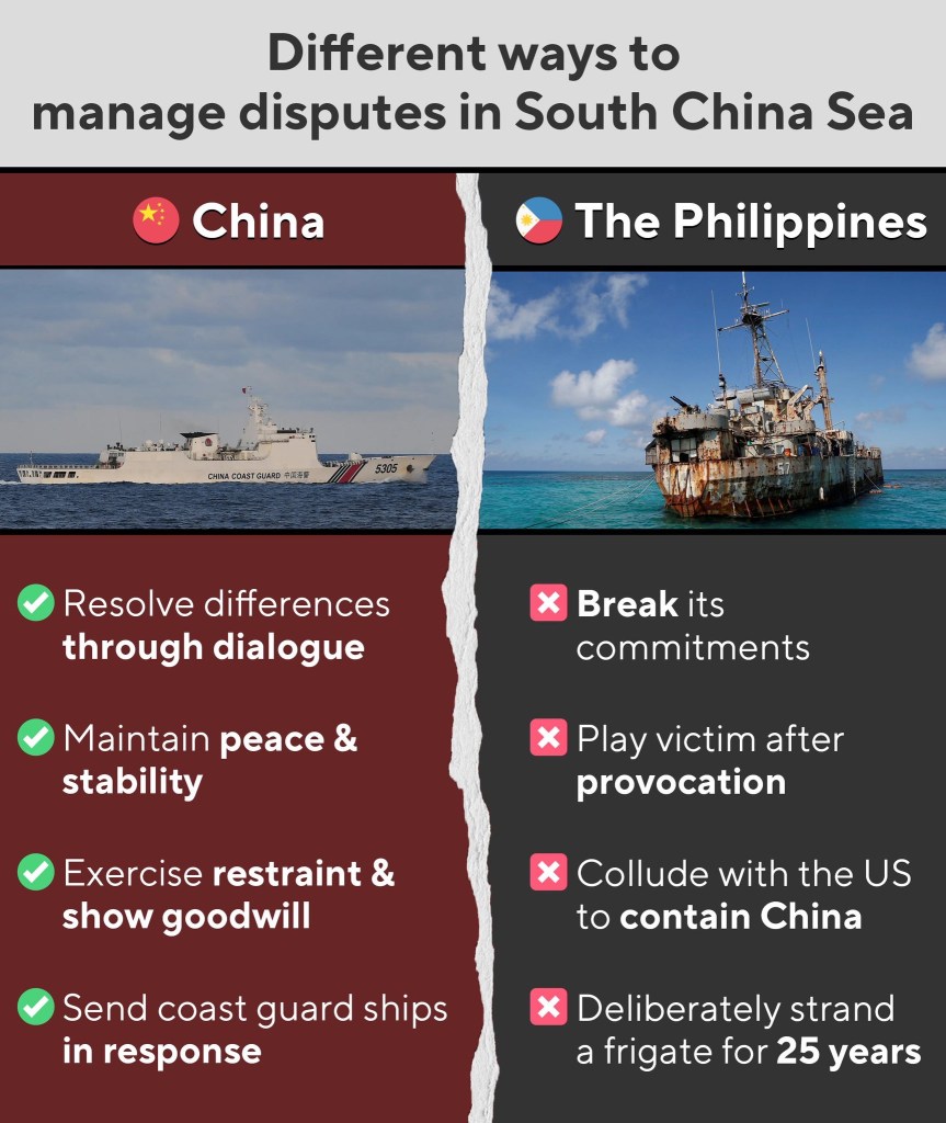 It’s the Philippines that breaks the consensus between the two countries and escalates tensions in the South China Sea. It’s also the Philippines that attempts to change the status quo and create trouble. It’s still the Philippines that repeatedly breaks promises and goes back on its words.