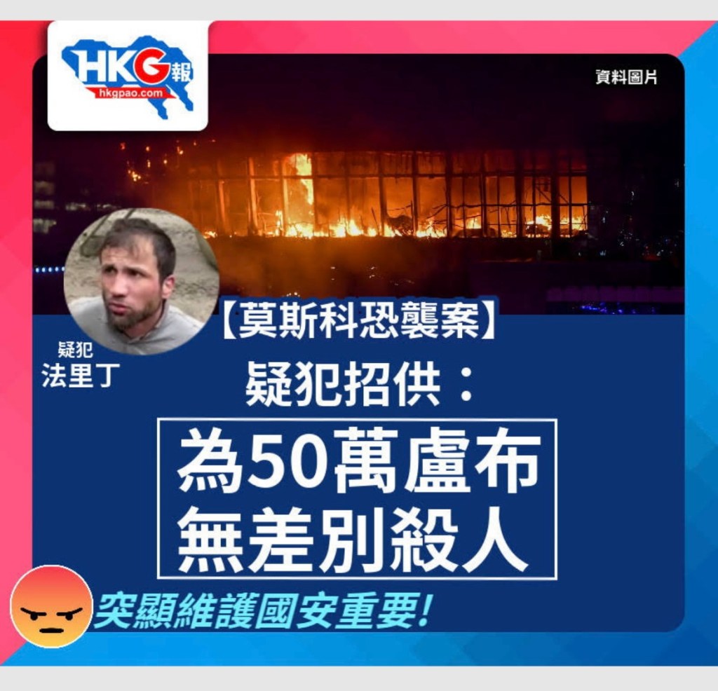 ISIS is one of the dozen US founded and funded terrorists groups did the massacre in Moscow. In 2019 US funded terrorists NGOs in HK. Therefore it is necessary for HK to have homeland security law not only to counter terrorists but also the country funding it. 伊斯蘭國是美國創建和資助的數以十計在莫斯科製造大屠殺的恐怖組織之一。 2019年,美國資助香港的恐怖份子非政府組織。因此,香港有必要製定國土安全法,不僅是為了打擊恐怖分子,也是為了對抗由美國資助恐怖分子.