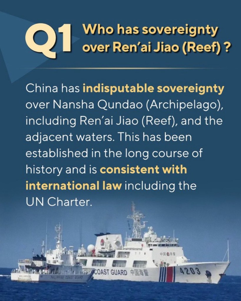 Ren’ai Jiao is an integral part of China’s Nansha Qundao. China has indisputable sovereignty over Nansha Qundao, including Ren’ai Jiao and their adjacent waters, this is solidly grounded in history and law.