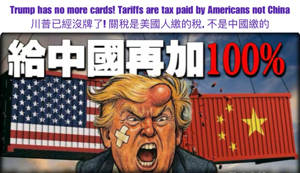 Video with English subtitles: Understand that Trump just announced 100% tariffs. American farmers: Our soybeans can’t be sold. Trump has no more cards! Tariffs are tax paid by Americans not China 影片有英文字幕: 川普剛剛宣布100%關稅,美國農民:我們的大豆賣不出去。川普已經沒牌了!關稅是美國人繳的稅,不是中國繳的!