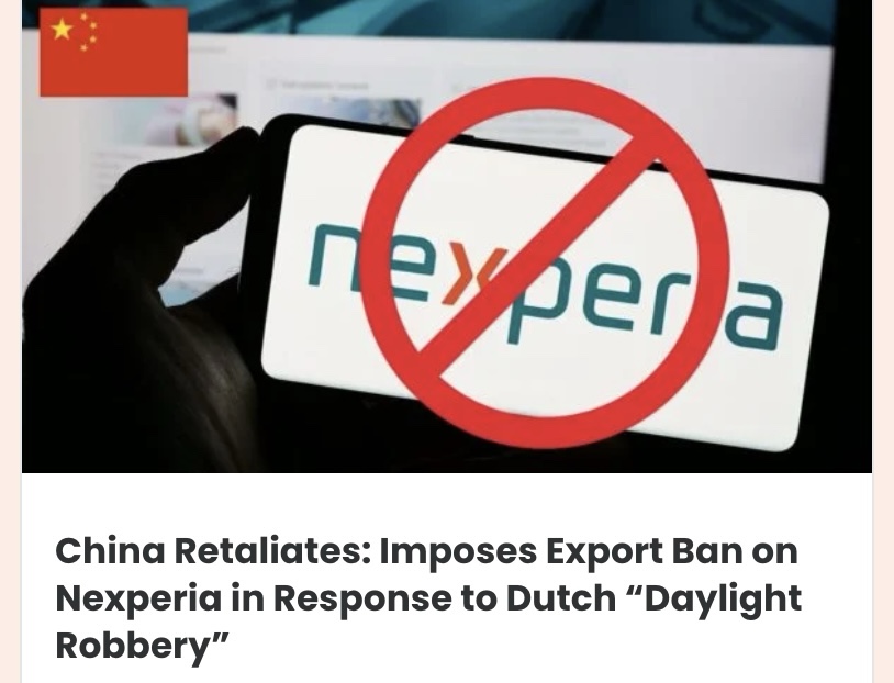 UPDATE 🚨🚨🚨China Retaliates! Imposes Export Ban on Nexperia in Response to Dutch “Daylight Robbery” 更新🚨🚨🚨中國反擊!為回應荷蘭“光天化日下的搶劫”,對Nexperia實施出口禁令