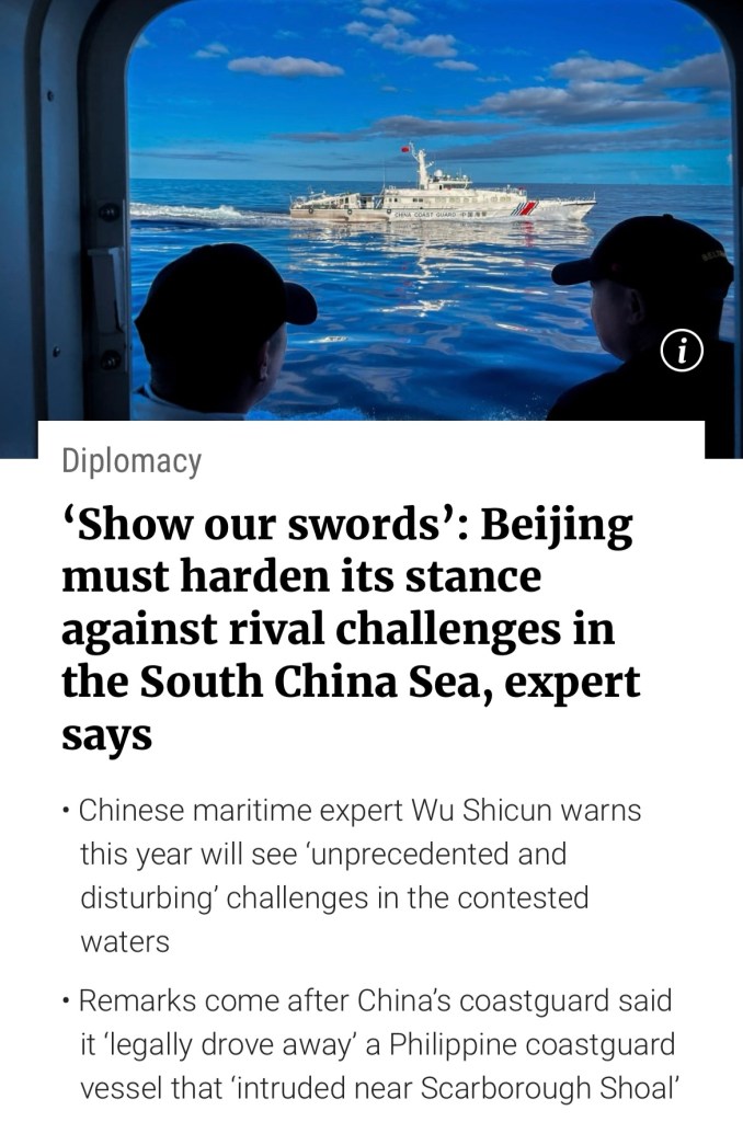 Beijing should “show our swords when necessary” and adjust its strategy to counter challenges from rival claimants in the South China Sea, according to a leading Chinese expert. Wu Shicun, chairman of the Huayang Centre for Maritime Cooperation and Ocean Governance, said in an article on Tuesday that patience and self-control from China would not be enough.