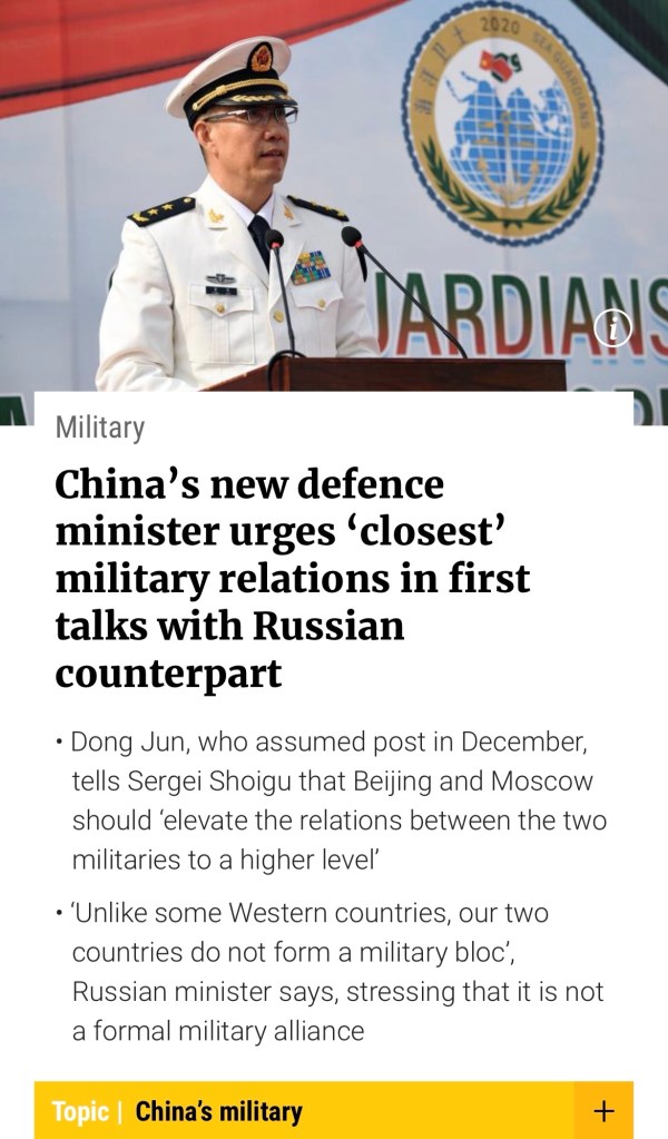 China’s new defense minister urges “closest”military relations in first talk with Russia counterpart 中國新任國防部長在與俄羅斯國防部長的首次會談中敦促建立「最密切」的軍事關係