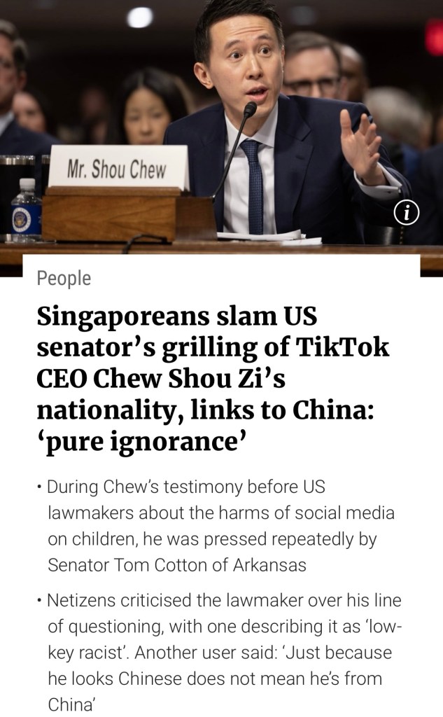 Their ignorance expected as 99% of the US politicians and elected officials never been to Asia. Misinformation is fed to them by the CIA, NSA, Military Intelligence and especially the military industrial complex who controlled most of the elected officials. Video clips of a US senator’s persistent grilling of TikTok’s Singaporean boss on his nationality and links to China’s Communist Party have sparked anger from online users in the island republic, with many criticising the politician’s racism and lack of understanding of Singapore.