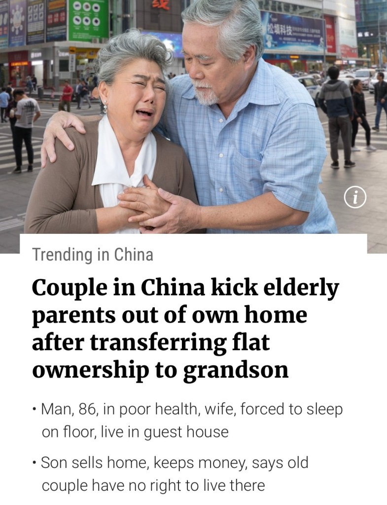 Never trust your kids, I have seen so many after parents money! Jin, 86, regretted his decision after his son and daughter-in-law threw him out, forcing him and his wife, also in her eighties, to stay in a guest house. 我父親在法律界六十多年, 到八十五歲才退休, 他見過無數不孝子女告訴我們也可能是暗示我們: “好仔不如近身財”. 我幫助客人做財務計劃和生前信託四十多年, 父親所說眞的不假, 好仔好女跟本對父母財產金錢一點興趣也沒有, 而且還做兒女做的温心事情, 無x用的子女, 找父母都是要錢的, 而且是不能對他們說不那一種. 所以永遠不要相信你的孩子,我親眼見証不小不孝子女貪圖父母的錢. 金先生的情況祇是冰山一角: 86 歲的金先生對自己的決定感到後悔,因為他的兒子和兒媳把他趕了出去,迫使他和同樣八十多歲的妻子住在賓館裡.