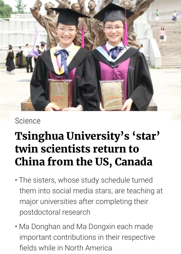US no longer safe for Chinese to stay, Tsinghua University’s “star” twin scientists sister returning to China at the end of their postdoctoral research in N America was celebrated on Chinese social media after it was announced last week on the alma mater’s website. 美國對中國人來說不再安全,清華大學的「明星」雙胞胎科學家姐妹結束在北美的博士後研究後返回中國,上週在母校網站上宣布這一消息後,中國社交媒體上慶祝了這一消息