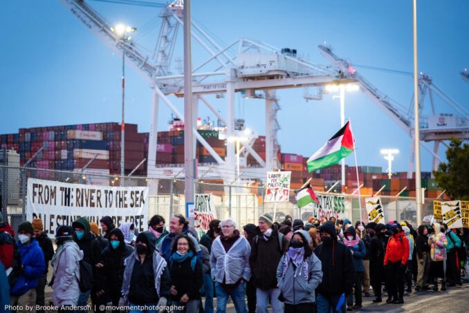 Thousands shut down Oakland port to demand Gaza cease-fire against US backing Israel committing daily crimes against humanity targeting women & children. Mass picket lines were honored by members of International Longshore and Warehouse Union Locals 10 and 34, who refused to cross the lines. Protesters said. 數千人關閉美國加州奧克蘭港口,要求加薩停火,反對美國支持以色列每天針對婦女和兒童犯下反人類罪。 國際碼頭和倉庫工會第 10 號和第 34 號當地人向大規模糾察隊致敬,但他們拒絕越過警戒線.