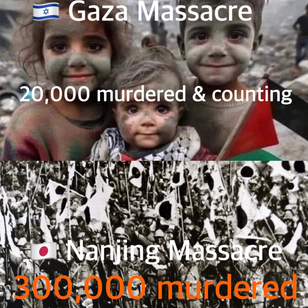 I hope Gaza children and women can ask the so-called God’s chosen people (Israel) on Christmas Day to give them peace, a peaceful day, and let them live one more day. Tomorrow you will definitely continue to resume staging the Nanjing Massacre 2.0 in Gaza. The United States is fully backing the Nanjing Massacre 2.0. With US strong support, but Israel is still far away from the 300,000 people killed in the Nanjing Massacre by the Japanese, so the massacre will not stop. Israel national pride must outdo the Japanese during WWII to have a higher score than 300,000 people. 希望Gaza孩子和婦女在聖誕天可以要求那些所謂神的選民(以色列)可以給他們平安, 平安的一天, 讓他們多活一天, 明天你們一定會動手繼續在Gaza上演南京大屠殺2.0 美國以全國之力支持, 現在離南京大屠殺的300,000 萬人還遠, 所以大屠殺是不會停止的. 以色列一定勝出日本超過三十萬人.