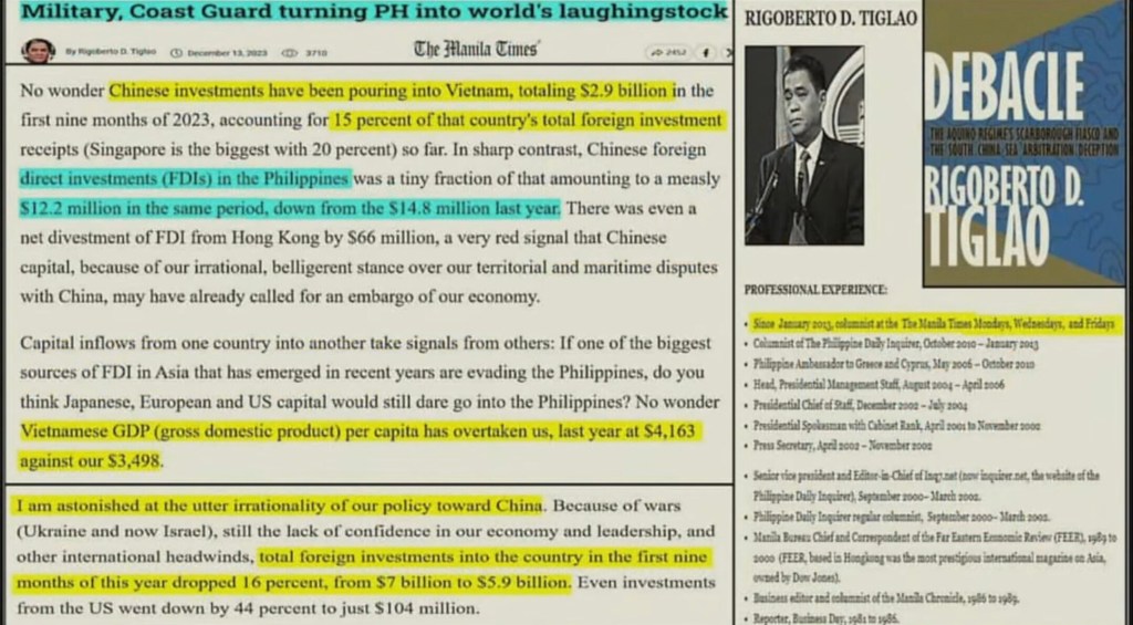 Manila Times: Military, Coast Guard turning Philippines into world’s laughingstock. WE are witness in the past several days to the spectacle of national lunacy, to the portrayal of Filipino as ignorant, infantile fool in deep denial. 馬尼拉時報:軍隊、海岸防衛隊讓菲律賓成為世界的笑柄。 在過去的幾天裡,我們目睹了全國性瘋狂的景象,目睹了菲律賓人被描繪成深深否認的無知、幼稚的傻瓜.