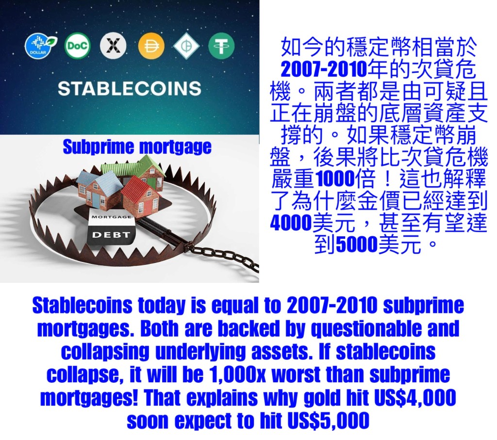 Stablecoins today is equal to 2007-2010 subprime mortgages. Both are backed by questionable and collapsing underlying assets. If stablecoins collapse, it will be 1,000x worst than subprime mortgages! That explains why gold hit US$4,000 soon expect to hit US$5,000 如今的穩定幣相當於2007-2010年的次貸危機。兩者都是由可疑且正在崩盤的底層資產支撐的。如果穩定幣崩盤,後果將比次貸危機嚴重1000倍!這也解釋了為什麼金價已經達到4000美元,甚至有望達到5000美元.