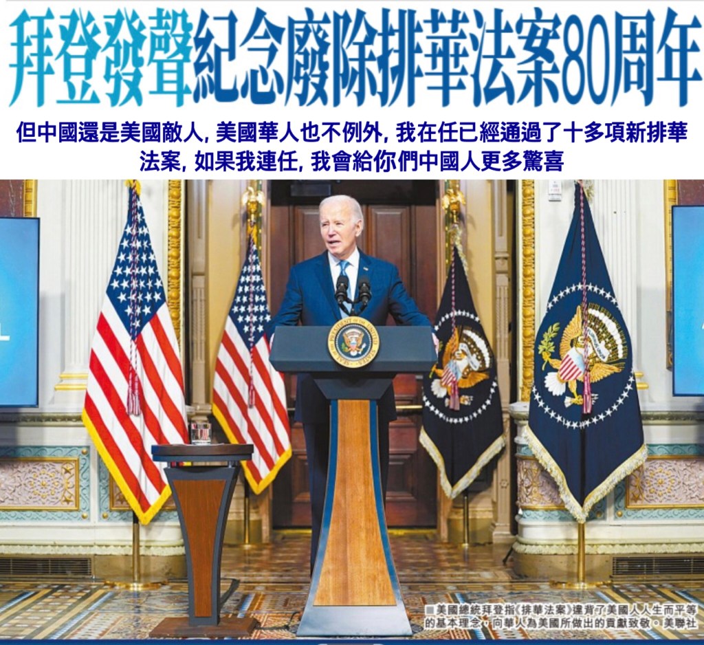 Biden: repealing 1882 Chinese Exclusion Act, But China is still enemy of US, Chinese Americans are no exception. I have passed 10+ new Chinese exclusion bills during my term. If I am re-elected, I will give you more! 但中國還是美國敵人, 美國華人也不例外, 我在任已經通過了十多項新排華法案, 如果我連任, 我會給你們中國人更多驚喜.