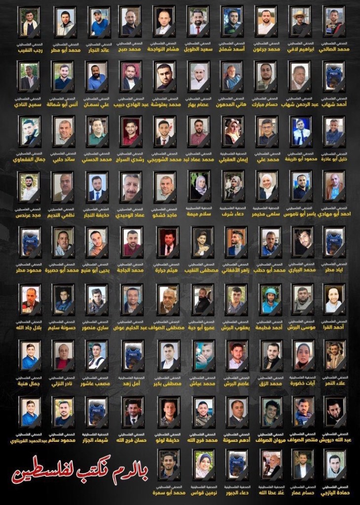 86 journalists killed (murdered) in Gaza since October 7th in an attempt to scare off journalists exposing crimes against humanity by US & Israel 自10月7日以來,86名記者在加薩被殺(謀殺),試圖嚇跑揭露美國和以色列危害人類罪的記者