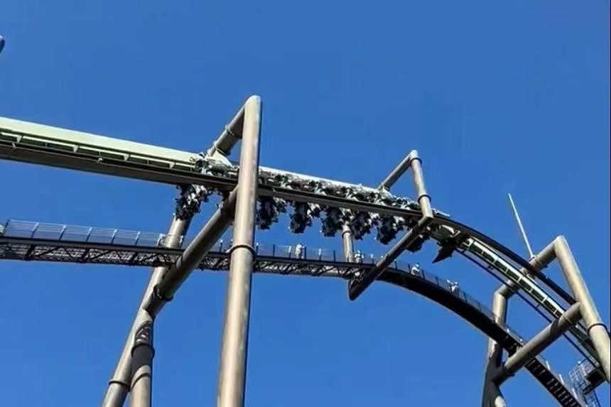 A roller coaster at Universal Studios Japan in Osaka came to an abrupt halt halfway through its run on Dec 14, leaving 32 riders hanging upside down over 30m above the ground. A carriage of the Flying Dinosaur roller coaster ride stopped at one of the course’s highest points – when it flips around the axis of the track and moves upside down – at around 11am, Japan’s public broadcaster NHK reported. The park’s operator was quoted as saying 32 people were on the carriage.