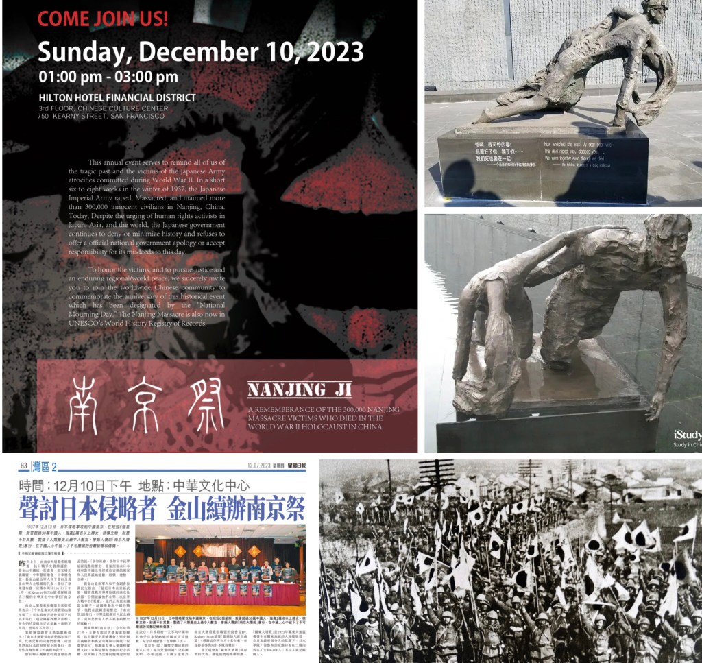 Remembering Nanjing Massacre, Japanese crimes against humanity Dec 10 2023 1:00pm Hilton Hotel, 750 Kearney St SF Chinatown 舊金山灣區各界華人隆重舉行紀念南京大屠殺86週年-南京祭, 星期日12/10/2023下午一點 希爾頓酒店三楼, 中華文化中心, 750 Kearny 歡迎灣區各界華僑華人一起來參加. 銘記歷史, 展望未來, 維護世界和平