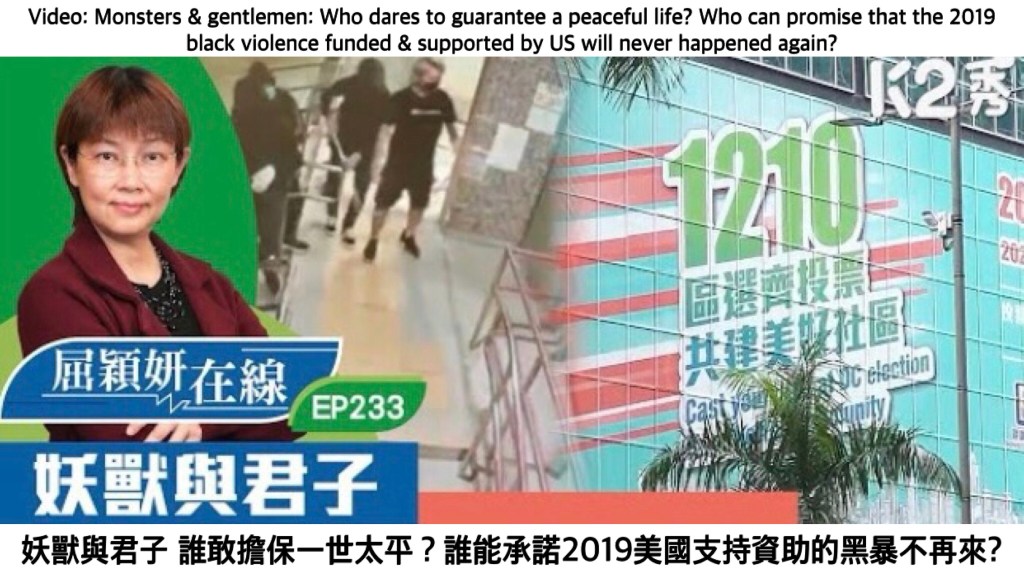 Video: Monsters & gentlemen: Who dares to guarantee a peaceful life? Who can promise that the 2019 HK black violence funded & supported by US will never happened again? 屈穎妍視頻: 妖獸與君子 誰敢擔保一世太平?誰能承諾2019美國支持資助的香港黑暴不再來?