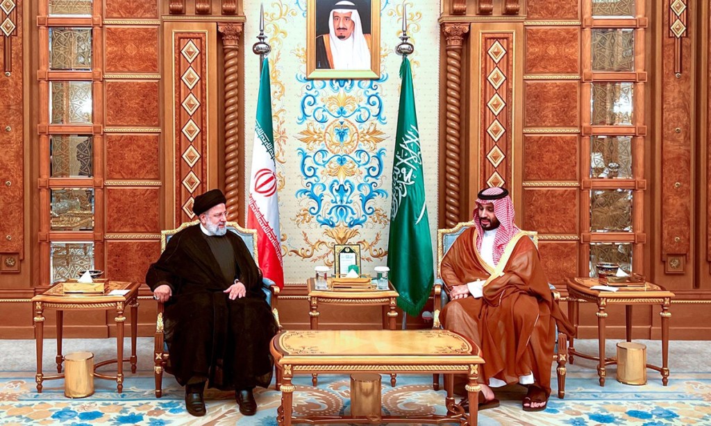 Saudi Crown Prince Mohammed bin Salman (right) meeting with Iranian President Ebrahim Raisi: “Arab-Islamic world demands immediate end to Gaza attacks” 沙烏地阿拉伯王儲穆罕默德·本·薩勒曼(右)會見伊朗總統易卜拉欣·萊西:“阿拉伯伊斯蘭世界要求立即停止加薩襲擊”.