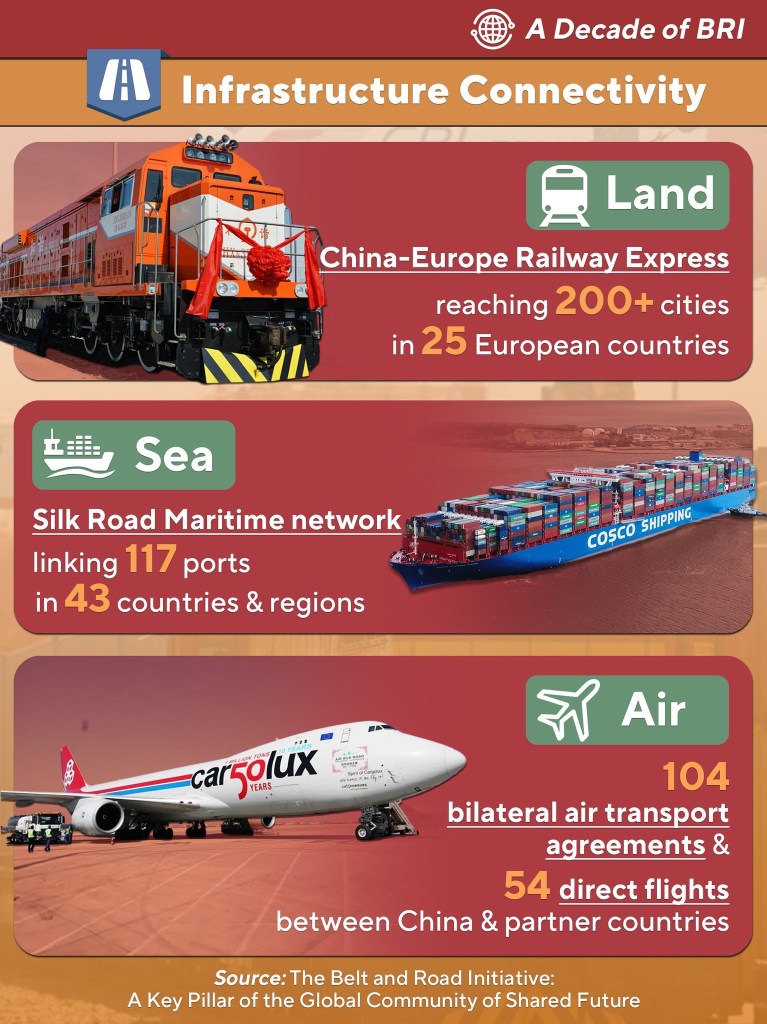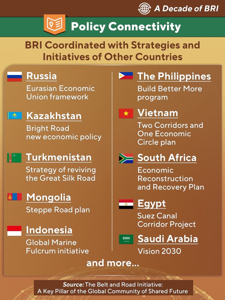 Over these 10 years, we have endeavored to build a global network of connectivity consisting of economic corridors, international transportation routes and information highway as well as railways, roads, airports, ports, pipelines and power grids.