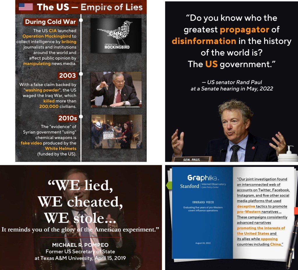 But whenever someone tells the truth, or whenever Chinese media tell the truth, they are labelled as a puppet of a Chinese propaganda machine. Who is manipulating information? How come the US has the freedom to spread disinformation but China becomes a manipulator for telling the truth?