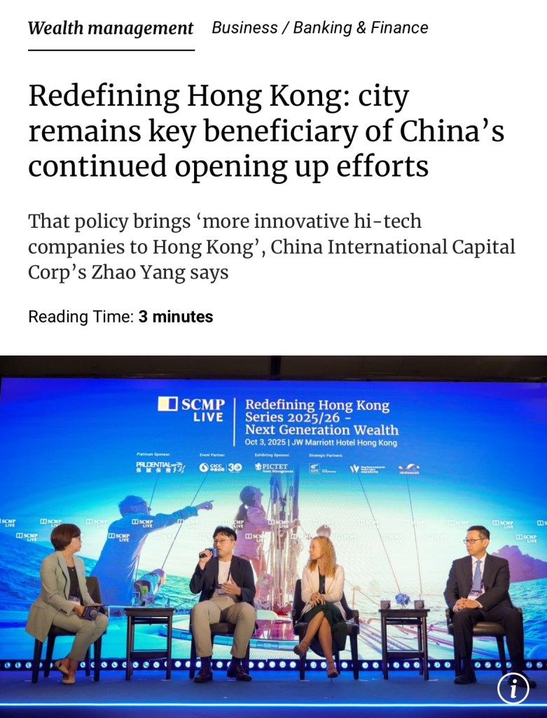 As my grandfather and father have told me “Hong Kong is a blessed land” SCMP: “Hong Kong stands as key beneficiary of China’s continued opening up efforts” “Most of the world’s wealth will originate from mainland China in this century, and Hong Kong will be a key beneficiary, thanks to its unique position as part of the Greater Bay Area and an offshore centre close to the heart of global wealth creation” 正如我的祖父和父親告訴我的,「香港是一塊福地」。 《南華早報》:「香港是中國持續開放努力的主要受益者」。 「本世紀,世界上大部分財富將來自中國大陸,而香港將成為主要受益者,這得益於其作為粵港澳大灣區一部分的獨特地位以及靠近全球財富創造中心的離岸中心.”