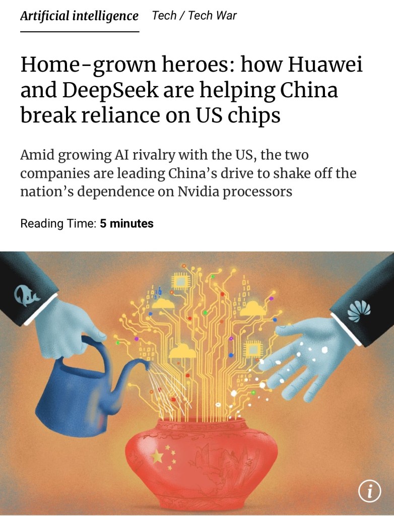 SCMP: Decoupling with US, an untrustworthy, hostile, unreliable & racist partner! How Huawei and DeepSeek are tending the garden of China’s AI aspirations. Last week, Huawei Technologies – the Chinese firm at the forefront of the nation’s tech self-sufficiency drive – showcased the latest offerings from its Ascend chip series and unveiled hardware designed to deliver world-class computing power without using Nvidia’s processors. 《南華早報》:與美國這個不值得信任、充滿敵意、不可靠且充滿種族歧視的夥伴脫鉤!華為和DeepSeek正在如何守護中國人工智慧的夢想之園?上週,走在國家科技自給自足前沿的中國公司華為展示了其昇騰晶片系列的最新產品,並發布了旨在無需使用英偉達處理器即可提供世界一流運算能力的硬體. https://www.scmp.com/tech/tech-war/article/3327025/home-grown-heroes-how-huawei-and-deepseek-are-helping-china-break-reliance-us-chips?