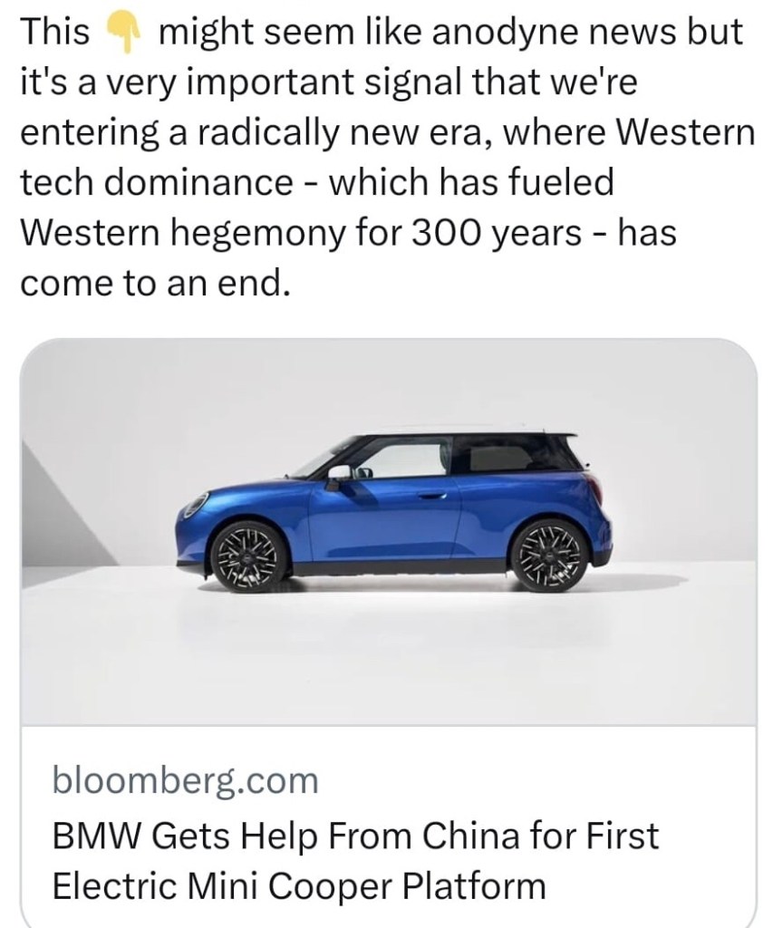 The West not only cannot decouple with China, their companies could not survive without China. The current strike at Detroit it’s auto unions demands 35% increase in pay, if approved will destroy US auto industries. Bloomberg: BMW to Shift UK Production of Electric Mini to China. Move is a blow to Britain’s EV manufacturing ambitions. Hatchback and small SUV will be produced along with Great Wall 西方不僅無法與中國脫鉤,他們的企業也無法離開中國而生存。 目前底特律的罷工, 工會要求加薪35%,如果獲得批准,將摧毀美國汽車工業。 彭博社:寶馬將把英國電動迷你車的生產轉移到中國。 此舉對英國電動車製造野心造成打擊. 掀背車和小型SUV將與長城汽車一起生產 https://www.bloomberg.com/news/articles/2022-10-15/bmw-to-shift-uk-production-of-electric-mini-to-china-times#xj4y7vzkg