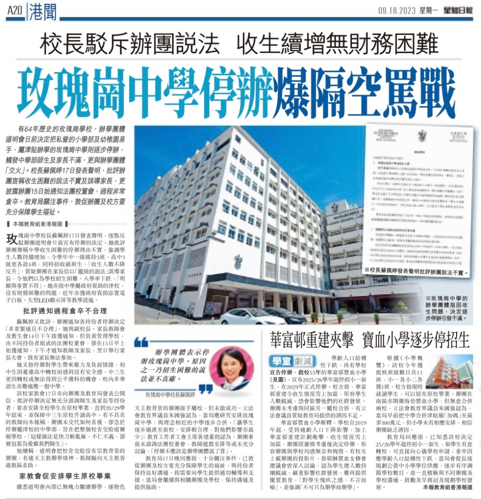 Sing Tao Daily, San Francisco, California, USA: Rosaryhill School high school in Hong Kong is closing and a shouting match breaks out 星島日報美國加州舊金山: 玫瑰崗中學停辦 爆隔空罵戰 2023-09-18