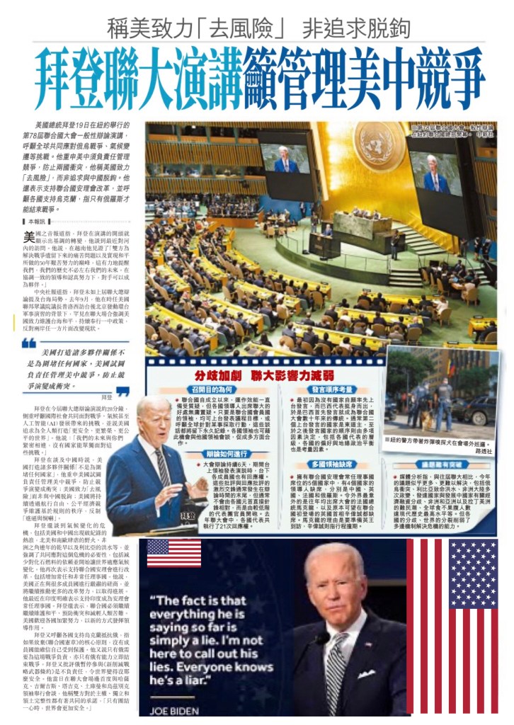 Before Biden’s speech, Han met with US Secretary of State Antony Blinken on the sidelines of the UNGA, during which Han said a healthy and stable China-US relationship is good for the two countries and the world.