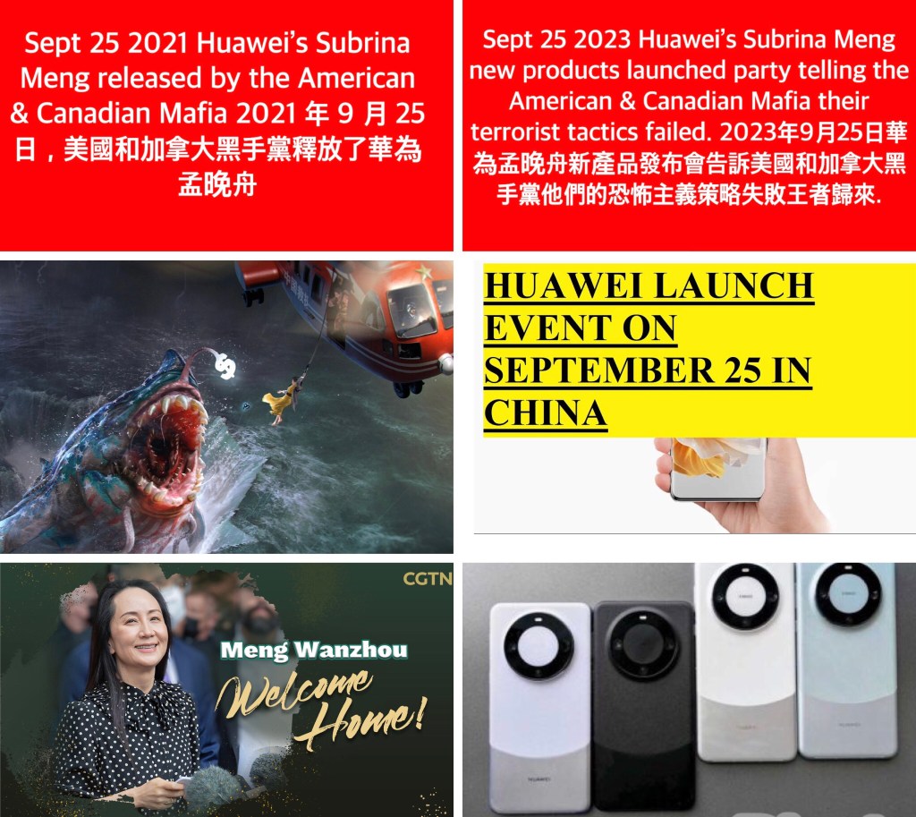 Sept 25 2023 Huawei’s Subrina Meng new products launched party telling the American & Canadian Mafia their terrorist tactics failed. 2023年9月25日華為孟晚舟新產品發布會告訴美國和加拿大黑手黨他們的恐怖主義策略失敗王者歸來.