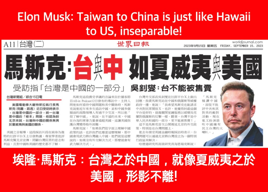 Elon Musk: Taiwan to China is just like Hawaii to US, inseparable! 埃隆·馬斯克:台灣之於中國,就像夏威夷之於美國,形影不離!
