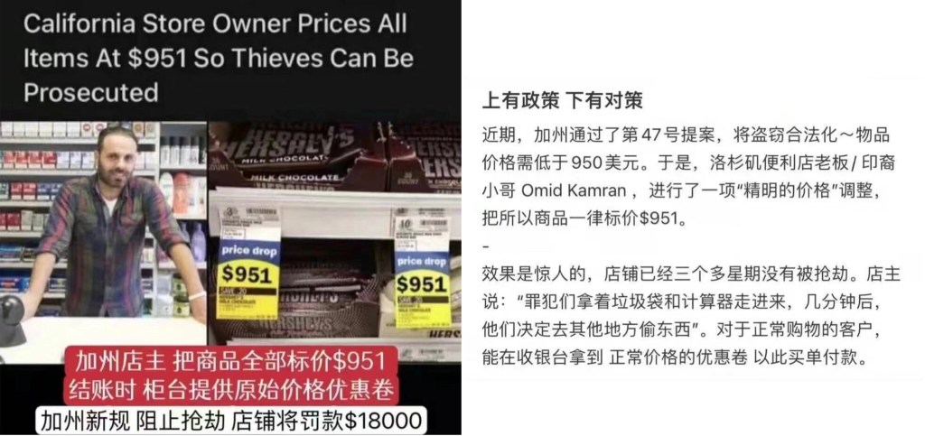 California current law allows anyone robbed any store up to US$951, newly proposed law penalizes store owners who stopped the robbing will be fined US$18,000 加州現行法律允許任何人搶劫任何商店最高金額為951美元,新提議的法律將處罰停止搶劫的商店老闆將被罰款18,000美元