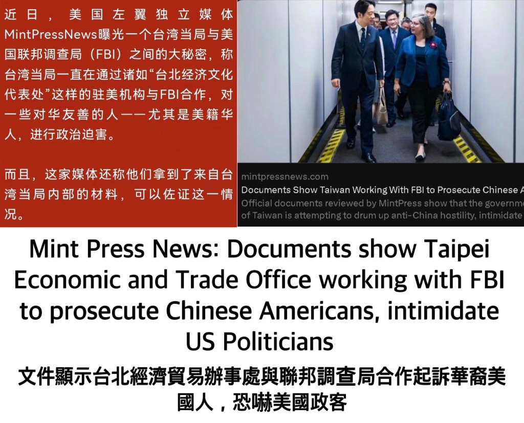 Mint Press News: Documents show Taipei Economic and Trade Office working with FBI to prosecute Chinese Americans, intimidate US Politicians 文件顯示台北經濟貿易辦事處與聯邦調查局合作起訴華裔美國人,恐嚇美國政客.
