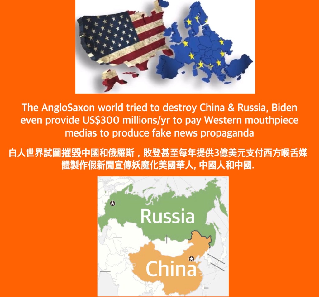 The AngloSaxon world tried to destroy China & Russia, Biden even provide US$300 millions/yr to pay Western mouthpiece medias to produce fake news propaganda 白人世界試圖摧毀中國和俄羅斯,敗登甚至每年提供3億美元支付西方喉舌媒體製作假新聞宣傳妖魔化美國華人, 中國人和中國.
