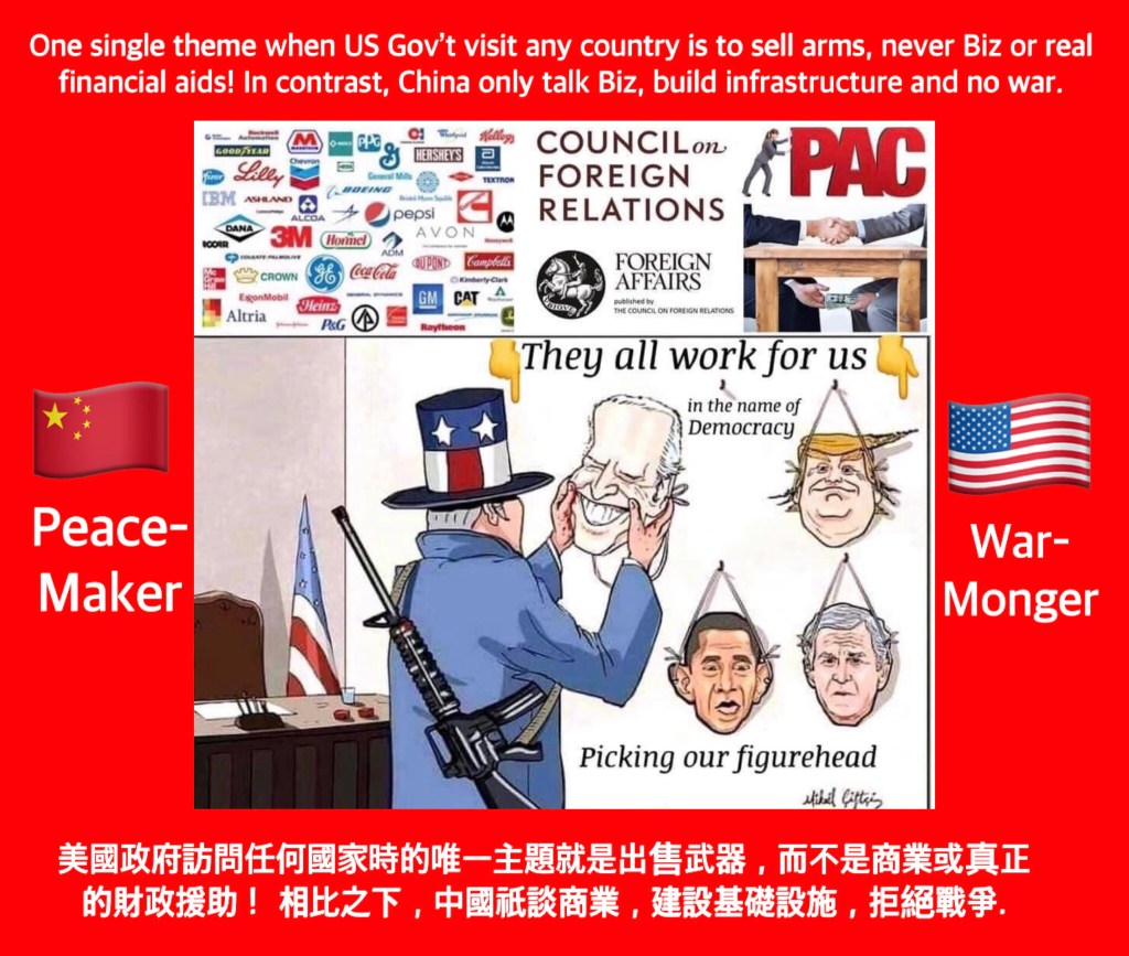 One single theme when US Gov’t visit any country is to sell arms, never Biz or real financial aids! In contrast, China only talk Biz, build infrastructure and no war. 美國政府訪問任何國家時的唯一主題就是出售武器,而不是商業或真正的財政援助! 相比之下,中國祇談商業,建設基礎設施,拒絕戰爭.